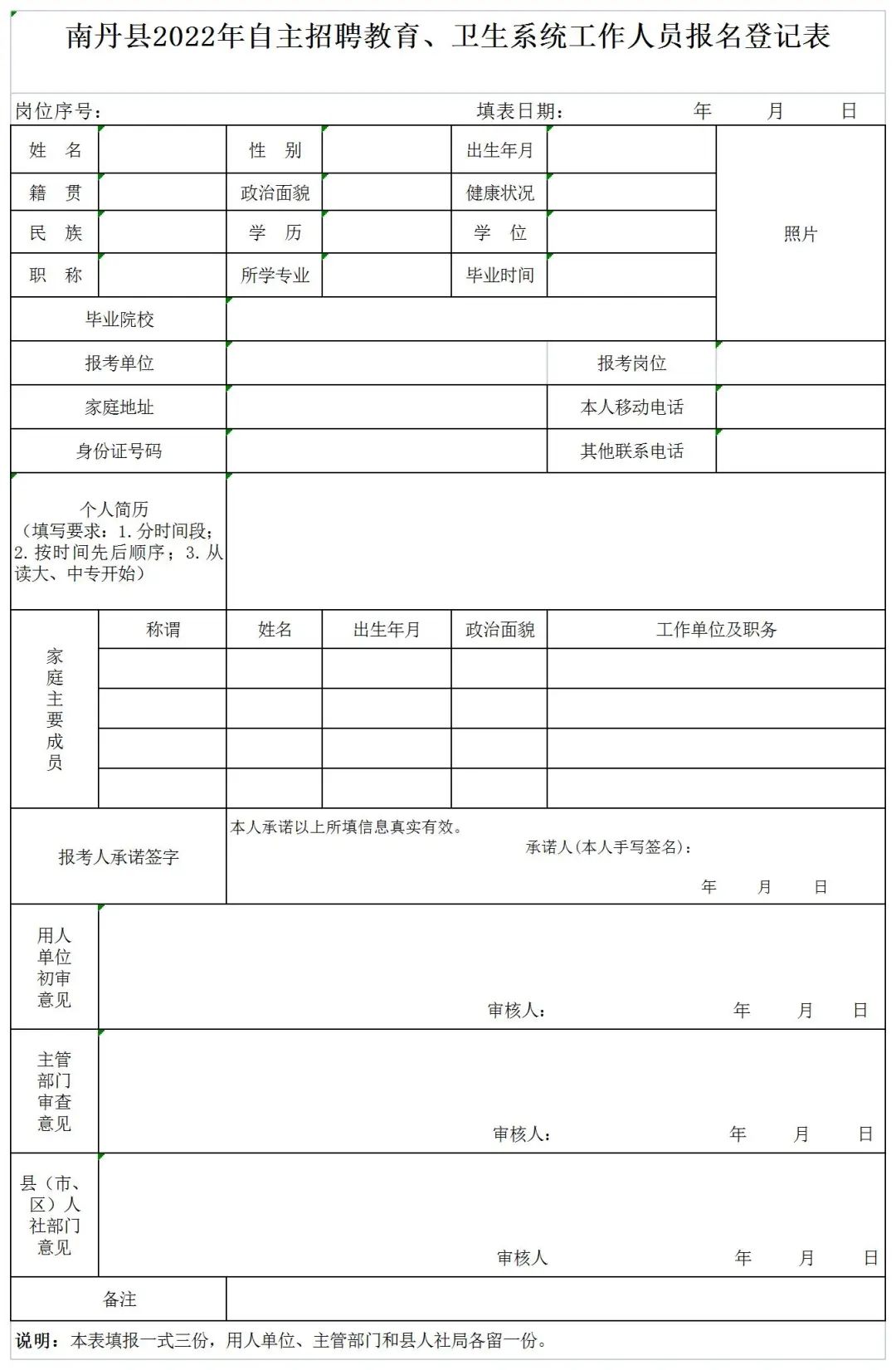 根据《南丹县2022年自主招聘教育卫生系统工作人员公告》要求,经县人社局、县卫生健康局、县委编办研究,决定在南丹县举行南丹县2022年自主招聘卫生系统工作人员专场招聘会,共招聘医疗卫生机构工作人员14个岗位21人,具体招聘岗位见《南丹县2022年自主招聘卫生系统工作人员岗位计划表(南丹县专场)》(图1),现将招聘有关事项公告如下:(一)招聘对象:凡符合《南丹县2022年自主招聘教育卫生系统工作人员公告》岗位条件要求的人员均可参加专场招聘,公告内容可在河池人才网(https://hc.gxrc.com/,2021年12月6日发布)上查阅。(二)报名时间:2022年10月9日—10月14日(三)报名方式:本次专场招聘采取网络报名方式。符合条件的对象通过邮箱发送所有报名材料和有关证件扫描件压缩文件包至报名邮箱:ndwjwrs@126.com。(四)报名要求:报名人员需提供身份证、毕业证、学位证书、专业技术资格证书、执业资格证等证件扫描件。自行下载填写《南丹县2022年自主招聘教育、卫生系统工作人员报名登记表》(图2)(一)审查时间:2022年10月17日—10月18日(三)审查程序:由招聘工作领导小组对报名考生进行面试资格初审,经初审符合招聘条件的,电话通知考生进行面试资格复审,考生携带身份证、毕业证、学位证书、专业技术资格证书、执业资格证等证件原件及《报名登记表》至南丹县卫生健康局人事股进行审查,经资格审查合格的,发放面试通知书。资格初审不合格的,不通知进行复审,不发放面试通知书。采取网络报名、资格审查、面试三个环节进行,经报名、资格审查、面试合格的人员按职位招聘数量从高分到低分办法确定签约人员名单并签订就业意向协议书。(一)在招聘组织实施过程中,将严格按照新冠肺炎疫情防控常态化有关要求落实防疫措施。具体疫情防控要求按照广西壮族自治区、河池市、南丹县疫情防控指挥部要求执行。有本土新冠肺炎确诊病例、无症状感染者所在县(市、区或直辖市的街道)或中高风险地区所在县(市、区或直辖市的街道)旅居史的人员,或有境外旅居史的人员,未完成规定的隔离管控措施的不能参加此次招聘会。(二)所有应聘者必须持本人48小时内新冠病毒核酸检测阴性报告、“广西健康码”为绿码、“通信大数据行程卡”为绿码、现场测量体温正常(<37.3℃)方可进入应聘现场参加招聘和应聘工作,所有人员必须佩戴口罩(考生自备)。健康码非绿码者、行程码非绿码者、体温异常者(超过37.3℃)均不得进入应聘现场。南丹县人力资源和社会保障局事业单位人事管理股:0778-7213685图:1.南丹县2022年自主招聘卫生系统工作人员岗位计划表(南丹县专场) 南丹县人力资源和社会保障局